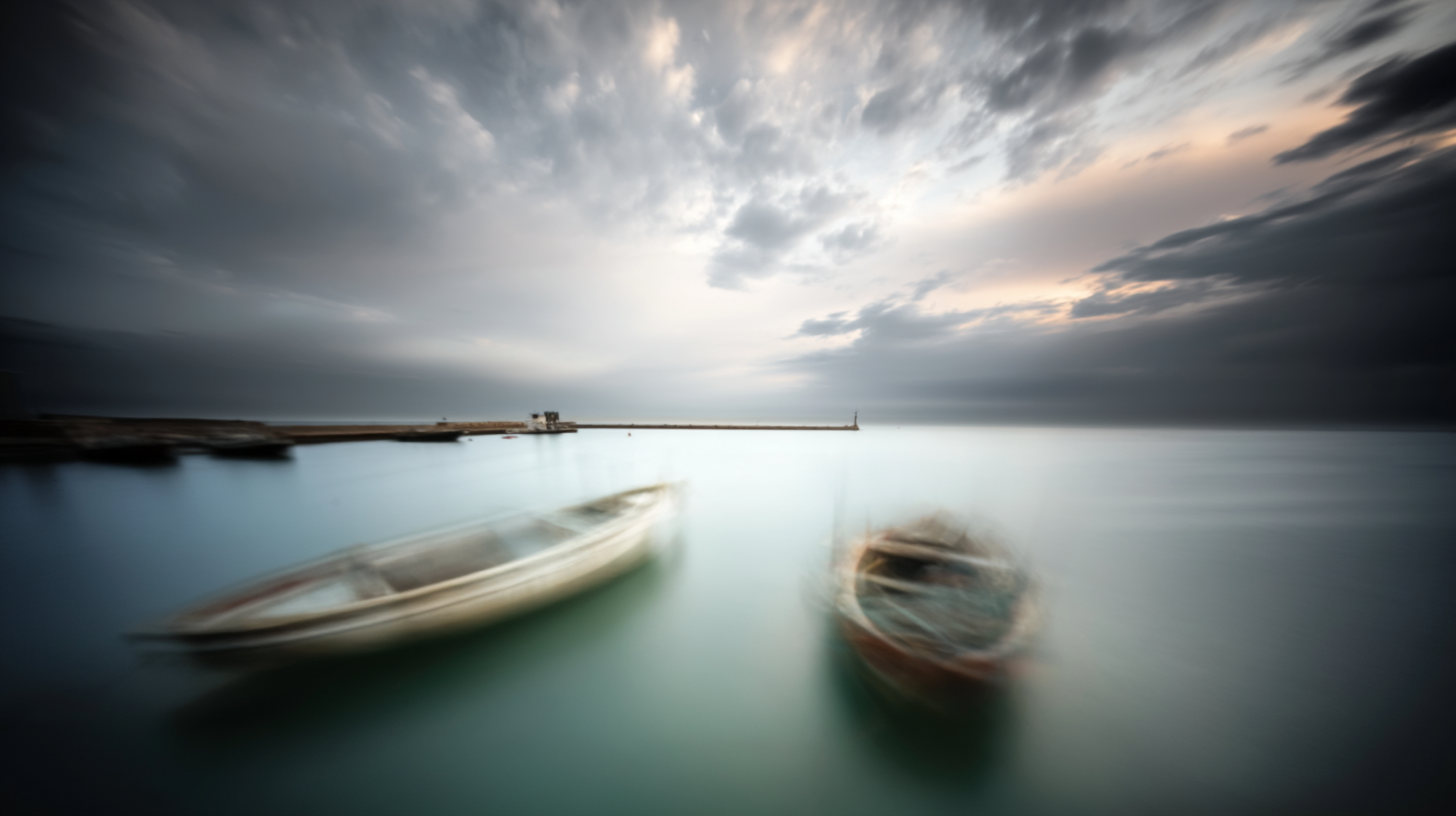 a small fishing harbor at dawn, pinhole camera long exposure, water becomes smooth silk, old boats become soft traces of presence, sky merges with sea, extreme vignetting, what remains after everyone has left --ar 16:9 --style raw
