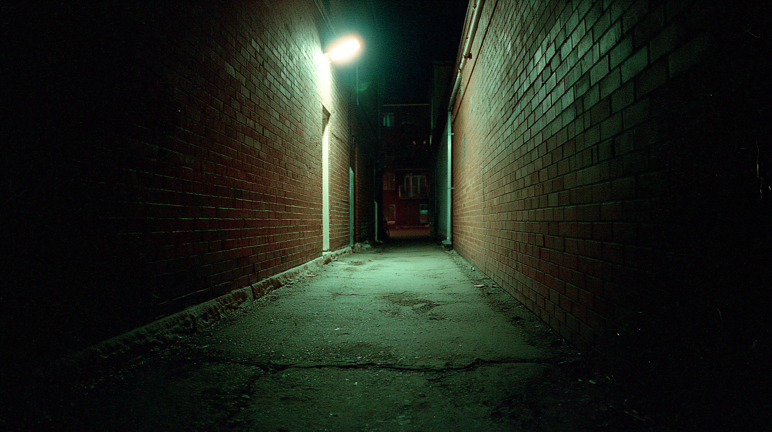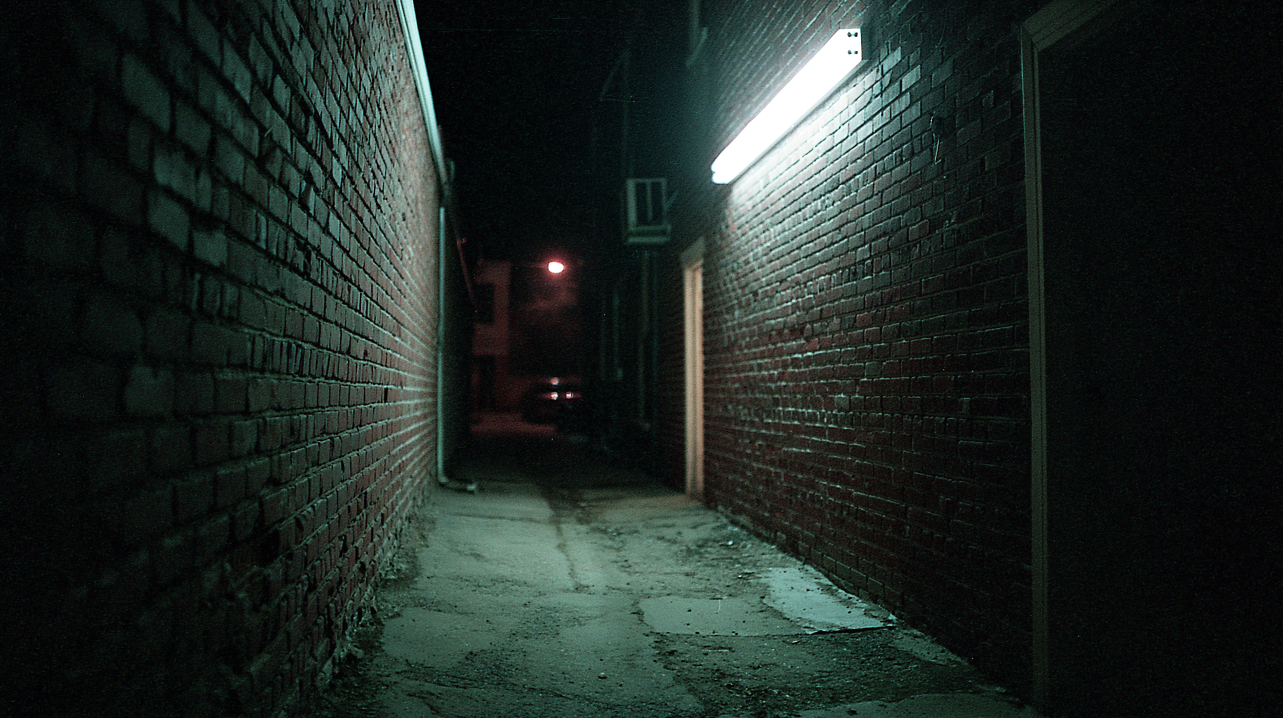 `narrow alley at night, single harsh fluorescent light mounted high on a brick wall, sharp-edged shadows on weathered ground, cold color temperature around 4000K, 35mm film grain, matte surface, architectural documentary style --raw --ar 16:9 --s 50`